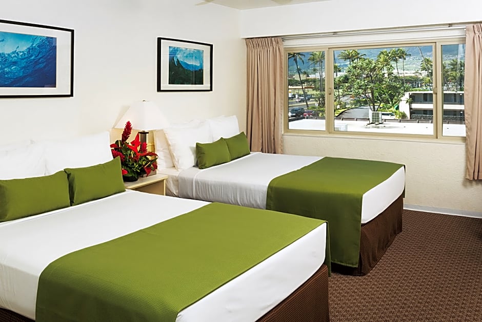 Maui Seaside Hotel rooms are clean and comfortable, with tropical views of the water, gardens or mountains. Rooms are equipped with 2 double beds or 1 king, featuring triple sheeting. Rooms are also equipped with flat screen TV, A/C, ceiling fan, private bathroom, hair dryer, direct dial phone, radio and alarm clock. You’ll be offered the best available room upon check-in at one low price. We do not charge a resort fee.